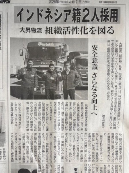 インドネシア国籍の特定技能ドライバーを二人採用。輸送体制の安定化を目指し、初めての外国人材を受け入れ組織の活性化と安全意識の更なる向上を図って参ります。